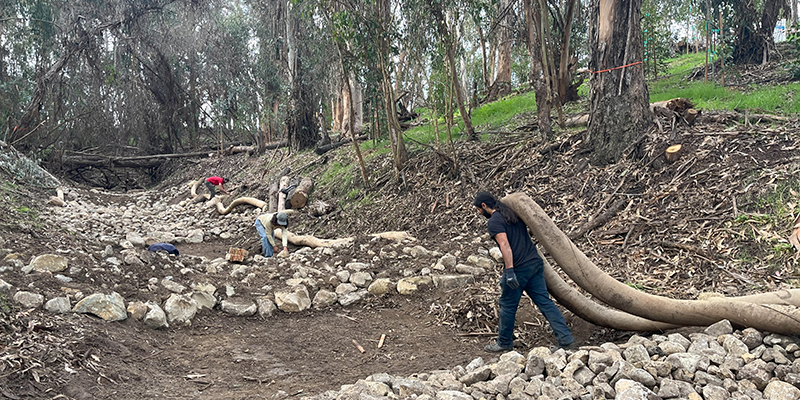 Computer modeled trail re-design to reduce prevailing wind impact to nesting Monarch Butterflies, physical trail construction, complete restoration of creek including rock armoring and replanting, and custom milled and built redwood bench interpretive area utilizing onsite downed eucalyptus for bench bases.